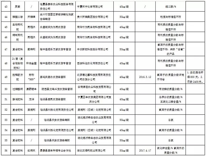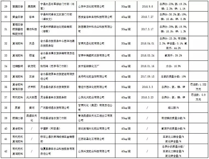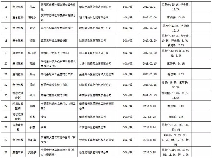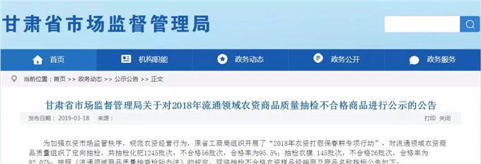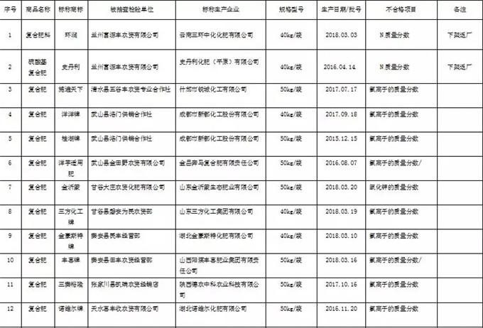 為加強(qiáng)農(nóng)資市場(chǎng)監(jiān)管秩序,規(guī)范農(nóng)資經(jīng)營(yíng)行為,原省工商局組織開展了“2018年農(nóng)資打假保春耕專項(xiàng)行動(dòng)”,對(duì)流通領(lǐng)域農(nóng)資商品質(zhì)量組織了定向抽檢,共抽檢化肥1245批次,不合格56批次,合格率為95.5%;抽檢農(nóng)膜 145批次,不合格26批次,合格率為82.07%;按照《流通領(lǐng)域商品質(zhì)量抽查檢驗(yàn)辦法》的規(guī)定,現(xiàn)將抽檢不合格農(nóng)資樣品經(jīng)銷商及商品名稱指標(biāo)公告如下: