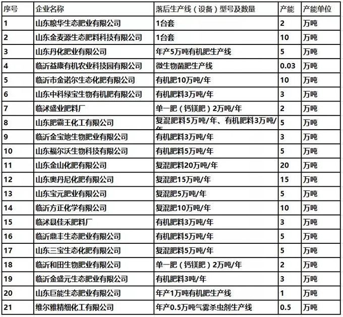 2018年度山東省工業(yè)行業(yè)淘汰落后產(chǎn)能企業(yè)名單(農(nóng)化企業(yè)部分)