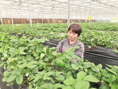 技術(shù)人員在特菜大觀園草莓溫室進行去除老葉作業(yè)。