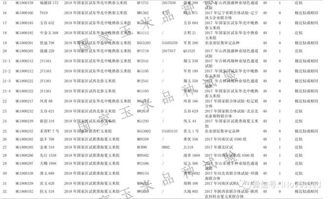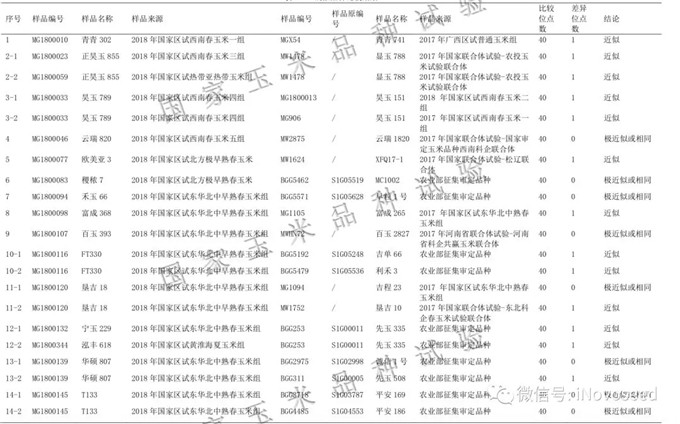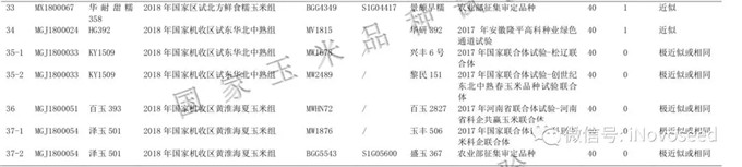 根據(jù) 2018 年國家玉米品種試驗方案提供的品種名單,與已知品種 DNA 指紋庫中的品種進行比對,將初步比對 出的疑似成套品種重新取樣后復(fù)檢,檢測出 37 套疑似品種(共涉及 39 個品種,詳見表下表)。