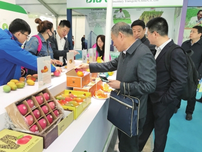 與會者在查看一家種子企業(yè)展臺前的水果新品種。本報記者李竟涵攝
