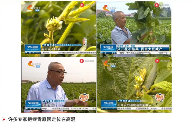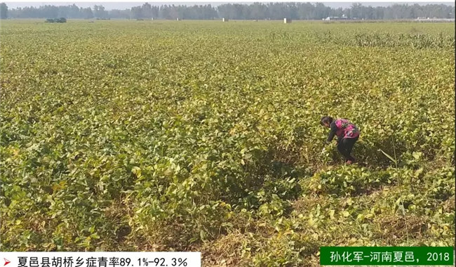 2018年大豆癥青現(xiàn)象更普遍,產(chǎn)量損失更嚴重,每畝產(chǎn)量僅有100-200斤,有的顆粒無收。