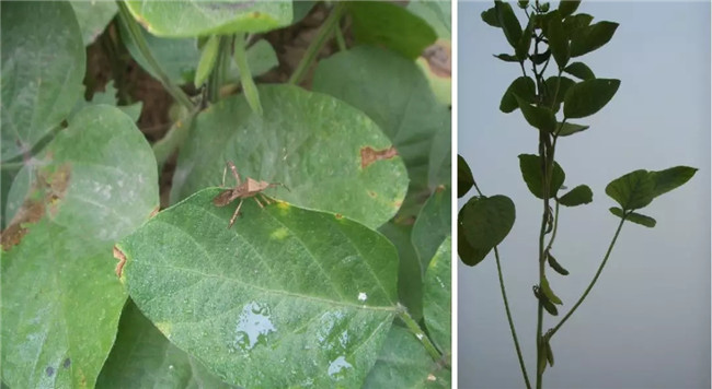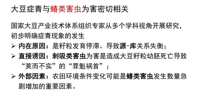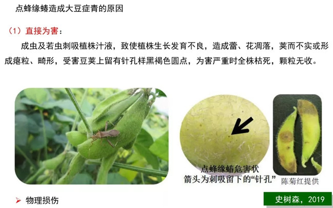 中國農(nóng)科院作物所研究員韓天富在剛剛結(jié)束的2019中國種子大會大田作物論壇上也指出,黃淮海地區(qū)大豆出現(xiàn)的癥青,不是由高溫引起的,而是點蜂緣蝽造成的。
