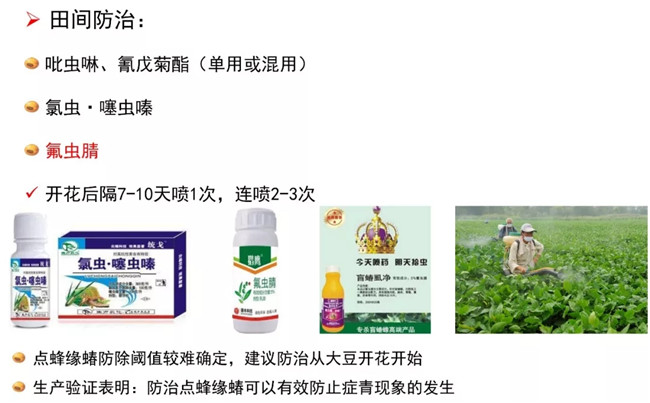 3、初花前用高效氯氟氰菊酯+吡蟲啉+戊唑醇噴霧防治點蜂緣蝽、蚜蟲、盲蝽象、大青葉蟬、豆天蛾和葉斑病等;