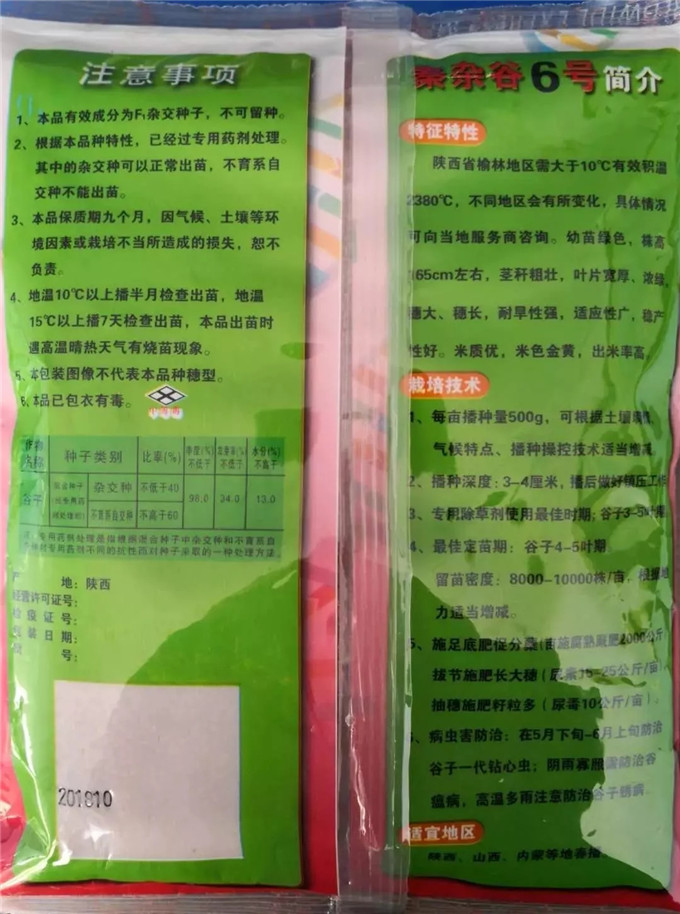 近日,有一些農(nóng)戶在山西五寨、神池等地購買了一個(gè)叫“秦雜谷6號”的谷種。經(jīng)向有關(guān)種子管理部門咨詢,原來這個(gè)“秦雜谷6號”竟然是非法銷售!這個(gè)標(biāo)注為榆林治忠雜交谷子研究中心研發(fā)、府谷縣田豐種苗有限責(zé)任公司生產(chǎn)經(jīng)銷的種子,在包裝上無注冊地地址、無生產(chǎn)經(jīng)營許可證編號、無檢疫證編號、無種子批號、無生產(chǎn)商聯(lián)系方式和信息代碼,屬于徹頭徹尾的“五無”產(chǎn)品。