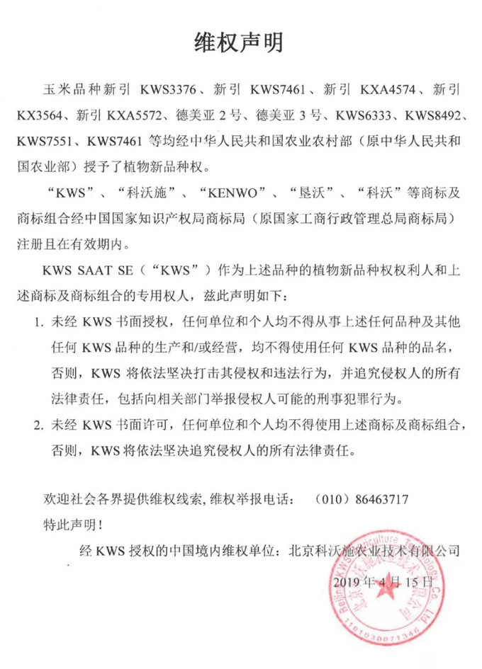 北京科沃施農(nóng)業(yè)技術(shù)有限公司經(jīng)KWS授權(quán)發(fā)布《維權(quán)聲明》