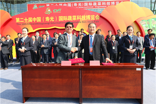 4月20日,在第二十屆中國(壽光)國際蔬菜科技博覽會開幕式上,中國農(nóng)業(yè)科學(xué)院副院長梅旭榮、濰坊市人民政府副市長馬清民為“中國農(nóng)業(yè)科學(xué)院壽光蔬菜研發(fā)中心”揭牌并簽署戰(zhàn)略合作協(xié)議,標(biāo)志著強強聯(lián)手的蔬菜學(xué)科政產(chǎn)學(xué)研深度融合平臺正式啟動。