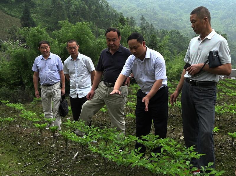 安康市種業(yè)管理局局長鮑平(右三)等領(lǐng)導(dǎo)參觀優(yōu)質(zhì)魔芋品種種源基地
