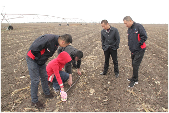 技術(shù)人員檢查播種效果并提出抗旱保墑、一次播種保全苗技術(shù)意見。