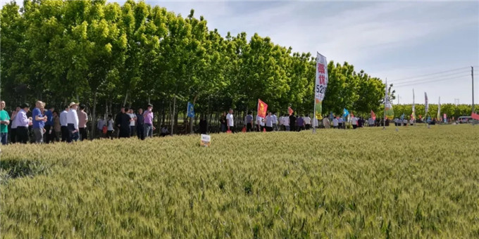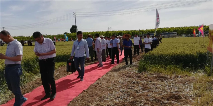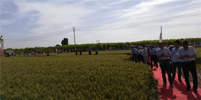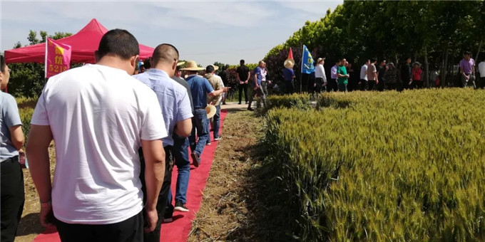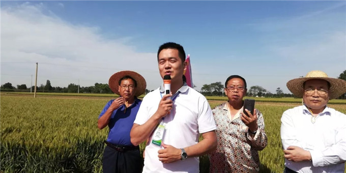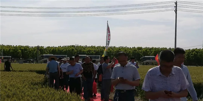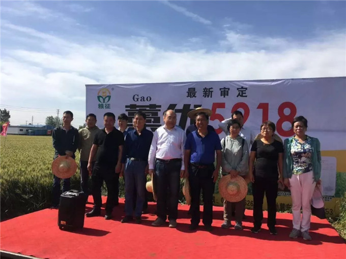 以河南省種子管理站副站長周繼澤為組長的2019年河南省小麥品種試驗考察組一組主要成員河南科技學(xué)院歐行奇教授、濮陽市種子管理站站長李會群、焦作市種子管理站劉長青、新鄉(xiāng)市種子管理站站長李璐、鶴壁市種子管理站站長張洪偉、商丘市種子管理站站長趙志宏、駐馬店市種子管理站站長吳長城、安陽市種子管理站站長馬文龍、河南省農(nóng)科院小麥所曹廷杰、河南省種子管理站鄧士政、劉桂珍等,河北省石家莊市藁城區(qū)農(nóng)科所副所長楊海川以及濮陽市糧食儲備庫、河南志情面業(yè)有限責(zé)任有限公司、河南金五谷糧貿(mào)有限公司、金豐農(nóng)業(yè)服務(wù)有限公司等糧食收儲企業(yè)代表和來自全省各地的經(jīng)銷商代表近200人現(xiàn)場觀摩了強筋優(yōu)質(zhì)小麥藁優(yōu)5218的田間表現(xiàn)。