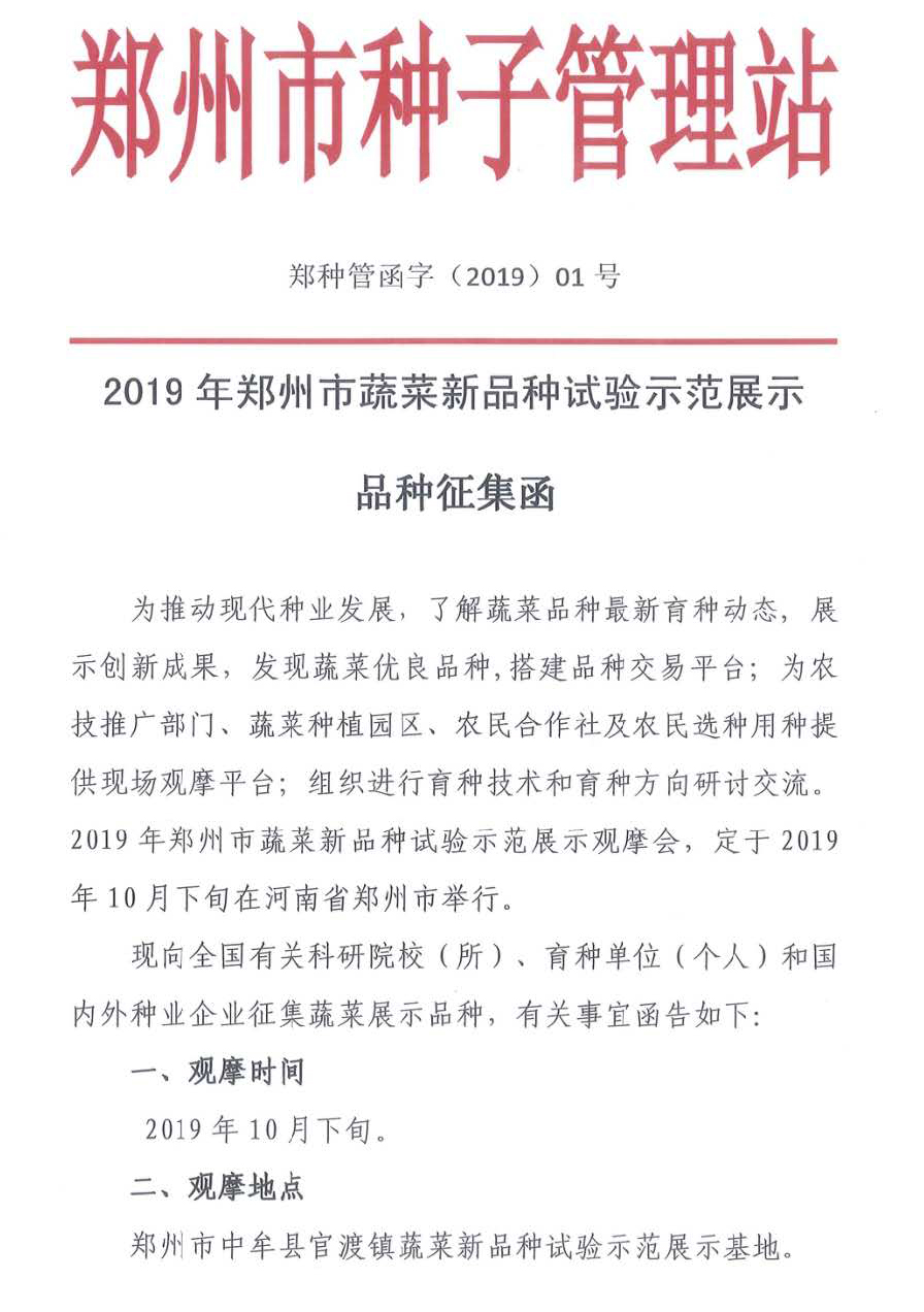 2019年鄭州市蔬菜新品種試驗示范展示品種征集函