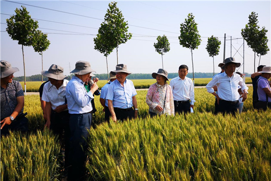 在南和縣閆里村金沙河基地,現(xiàn)場(chǎng)展出了7個(gè)農(nóng)業(yè)農(nóng)村部指定節(jié)水品種、13個(gè)節(jié)水苗頭品種、18個(gè)黃淮北片廣適組大區(qū)品種和17個(gè)節(jié)水組大區(qū)品種。展示區(qū)采用全程機(jī)械化作業(yè),每個(gè)展示品種面積1畝以上,與大田生產(chǎn)條件相似。參展品種在春季只澆一次拔節(jié)水的節(jié)水栽培條件下,表現(xiàn)出較高的產(chǎn)量潛力,有些還兼具抗寒耐熱、優(yōu)質(zhì)強(qiáng)筋等優(yōu)良特性,具有廣闊的發(fā)展?jié)摿?。作科所參展的輪選103、中麥5051、中麥6032、中麥6079、航麥3290等品種表現(xiàn)優(yōu)異,引起參會(huì)代表的廣泛關(guān)注。