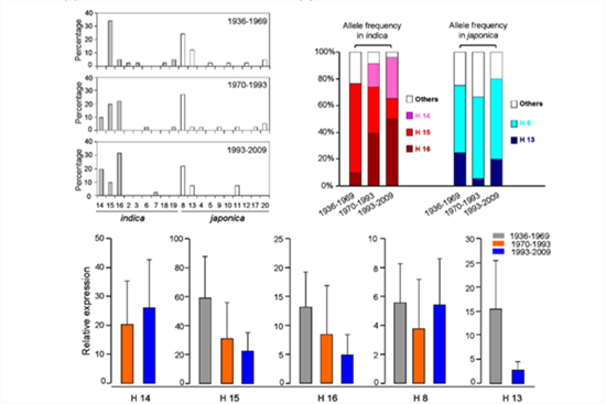 研究人員選取了123個(gè)從1936年到2009年育成的中國主栽大面積推廣品種,以分析Hd1單倍型與產(chǎn)量相關(guān)性狀的人工選擇。在這些品種中,粳稻主要有2種單倍型(H8和H13),而秈稻則有3種主要單倍型(H14、H15和H16)。等位基因頻率分析結(jié)果表明,Hd1基因在中國主栽的秈稻品種和粳稻品種中存在不同優(yōu)勢等位基因差異。早期的秈稻品種以H15為主要單倍型,近年育成的品種則以H16和H14為主要單倍型;而粳稻Hd1的單倍型始終以H8為主要單倍型。進(jìn)一步分析表明,秈型Hd1優(yōu)勢等位基因型H16是現(xiàn)代大穗型水稻育種的優(yōu)勢單倍型,其在二次枝梗數(shù)上有著明顯的人工選擇趨向。通過分子設(shè)計(jì)將秈稻H16單倍型導(dǎo)入粳稻品種春江06,在適當(dāng)延長粳稻抽穗期的同時(shí),顯著提高了粳稻春江06在海南種植的單穗產(chǎn)量(約增加19.7%),又保證了其粳稻原有的蒸煮食味品質(zhì)特性。