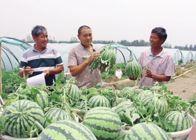 2014年,徐永久返鄉(xiāng)后,在郯城農(nóng)商銀行的扶持下流轉(zhuǎn)土地,帶領(lǐng)17戶親朋好友一起種植“8424”品種富硒西瓜。為了避免重茬,出現(xiàn)土傳病害,他們堅持每年輪換土地進(jìn)行種植。據(jù)介紹,他們每年的農(nóng)歷正月初五開始種植,進(jìn)入五月西瓜便陸續(xù)成熟。常規(guī)種植西瓜,只能采摘一茬,由于管理得當(dāng),徐永久種植的西瓜可連續(xù)采摘四茬,能一直采摘到農(nóng)歷八月十五。合理的施肥讓他生產(chǎn)的西瓜糖分高、口感好,每年瓜未成熟便被縣城超市全部提前訂購,畝收入一萬多元。圖為徐永久(左一)正在接待前來批發(fā)西瓜的客商。