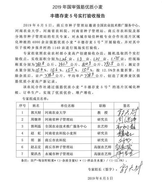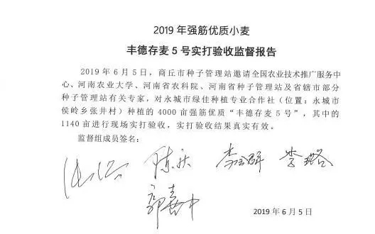 應(yīng)商丘市種子管理站的邀請(qǐng),河南農(nóng)業(yè)大學(xué)、河南省農(nóng)科院、河南省種子管理站、商丘市農(nóng)科院以及部分地市種子管理站的有關(guān)專家對(duì)永城市綠佳種植專業(yè)合作社連片區(qū)域化種植的4000余畝強(qiáng)筋優(yōu)質(zhì)小麥豐德存麥5號(hào)開展驗(yàn)收,并對(duì)位于張井村的1140畝進(jìn)行實(shí)打驗(yàn)收。