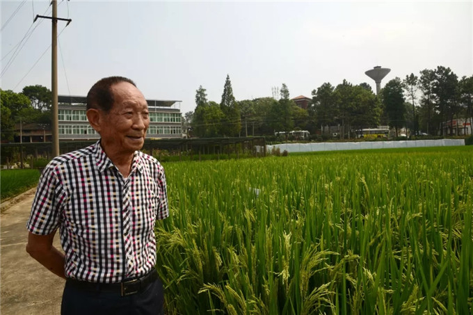 ▲2016年8月17日,袁隆平在位于湖南長沙的實(shí)驗(yàn)田里觀察超級雜交水稻。來源:新華社