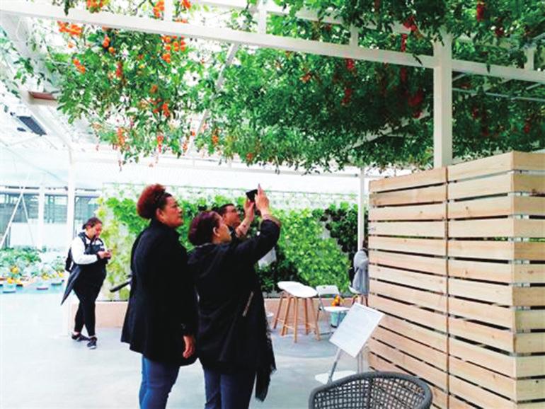 水培番茄樹、基質(zhì)盆栽甜椒,集諸多技術(shù)于一身,以獨(dú)特的現(xiàn)代栽培形式,打破傳統(tǒng)種植模式,使得普普通通的果蔬集賞食功能于一體,打造出兼具觀賞價(jià)值和采摘食用價(jià)值的現(xiàn)代農(nóng)業(yè)獨(dú)特景觀,具有現(xiàn)代化、產(chǎn)量高、綠色安全、省工等特點(diǎn),是現(xiàn)代農(nóng)業(yè)發(fā)展中的一道別致的景觀。