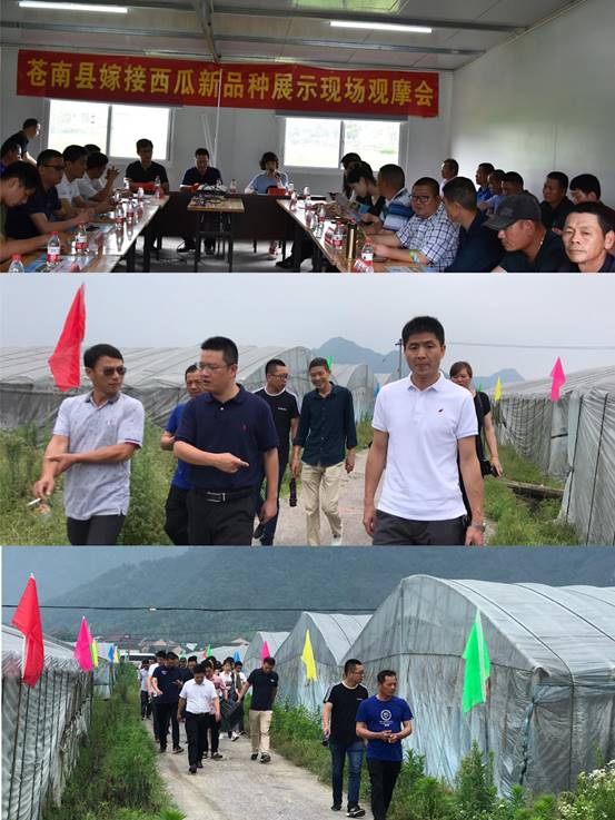 與會人員先后考察了藻溪鎮(zhèn)山下坡村和沿浦鎮(zhèn)沿浦村嫁接西瓜新品種篩選試驗基地,聽取現(xiàn)場介紹?,F(xiàn)場張華峰老師開啟“田間課堂”模式,對部分品種的特性、栽培技術、市場前景等向進行了細致的講解,使參會人員對展示觀摩的西瓜品種的商品性,豐產(chǎn)性和適應性有了更直觀的認識,在種植的大棚對不同砧木與同一接穗、不同砧木與不同接穗等試驗進行認真研究,仔細觀摩,對種植表現(xiàn)好的嫁接西瓜新品種進行詳細了解,記錄在心?,F(xiàn)場代表們還對試驗的西瓜品種進行了品嘗鑒定,都稱贊品質好,口感佳。隨后,代表們還走進蒼南愛生種子有限公司參觀了現(xiàn)代化集約育苗基地。