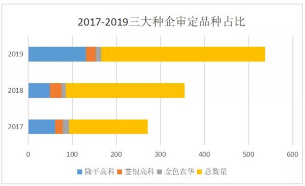 自2012年《全國(guó)現(xiàn)代農(nóng)作物種業(yè)發(fā)展規(guī)劃》(2012―2020)出臺(tái)后,科企深度融合,合作選育品種數(shù)量占比不斷提升,并受益于2014年開始試行的綠色通道政策。在政策持續(xù)發(fā)酵之后,企業(yè)自主選育及科企合作品種選育數(shù)量明顯加速,2017年占審定品種總數(shù)量比重高達(dá)93.8%,2018年占比89.2%,2019年占比91.1%,種企成為新品種選育的主角。