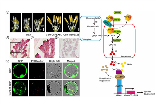 該團(tuán)隊(duì)以水稻小穗發(fā)育畸形突變體為材料,通過圖位克隆的方法鑒定了一個(gè)編碼過氧化物酶體受體蛋白基因OsPEX5。OsPEX5蛋白可以與茉莉酸生物合成途徑的12-氧-植物二烯酸還原酶發(fā)生互作并影響其過氧化物酶體定位,造成突變體中茉莉酸含量下降,且通過外源甲基茉莉酸處理可以部分恢復(fù)其小穗異常的表型。進(jìn)一步研究還發(fā)現(xiàn),水稻茉莉酸信號途徑中的正向調(diào)控因子可以結(jié)合到花發(fā)育關(guān)鍵基因的啟動子上并激活它們的表達(dá),并且這種激活作用會被茉莉酸信號途徑中的負(fù)調(diào)控因子所拮抗。該研究完善了茉莉酸調(diào)節(jié)植物生殖發(fā)育的分子機(jī)制,并為調(diào)控植物中茉莉酸的生物合成提供了重要的理論基礎(chǔ)。
