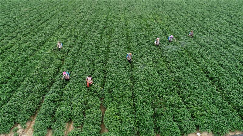 8月7日,在河南省光山縣椿樹崗村天隆農(nóng)業(yè)蔚藍(lán)合作社紅薯種植基地內(nèi),社員們正在地里給紅薯秧苗噴施葉面肥。立秋節(jié)氣將至,隨著氣溫下降,該合作社的社員們抓緊給紅薯秧苗噴施葉面肥、除草等管理工作,田間地頭一派繁忙景象。據(jù)介紹,該合作社今夏引進(jìn)種植了優(yōu)質(zhì)品種一點(diǎn)紅、西瓜紅、紫羅蘭、雞骨香等四個(gè)品種紅薯500余畝,采取“基地+合作社+農(nóng)戶”的種植管理模式,預(yù)計(jì)畝產(chǎn)可達(dá)4000多元,已經(jīng)吸納當(dāng)?shù)?6名村民在家門口實(shí)現(xiàn)就業(yè)。