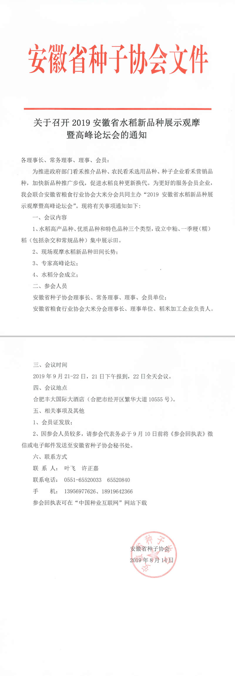 2019安徽水稻新品種展示觀摩暨高峰論壇會通知