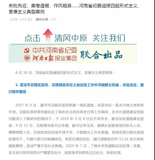 河南省紀(jì)委通報(bào)稱,漯河市召陵區(qū)政府、召陵鎮(zhèn)政府在土地征收工作中漠視群眾利益,未批先征、強(qiáng)行毀壞麥田。2017年9月,漯河市召陵區(qū)規(guī)劃修建一城區(qū)道路,但該項(xiàng)目一直未辦理土地審批手續(xù)。召陵區(qū)政府常務(wù)副區(qū)長丁曉永在主持區(qū)政府日常工作期間,在未對(duì)道路建設(shè)受阻問題深入了解研判的情況下,于2019年4月8日召開講評(píng)會(huì),要求加快道路建設(shè)進(jìn)度;4月12日,召陵鎮(zhèn)黨委書記李震、副書記李玉良、副鎮(zhèn)長趙振奎組織機(jī)關(guān)人員、鎮(zhèn)聘城管人員,在明知項(xiàng)目征地手續(xù)不全、少數(shù)群眾工作未做通、現(xiàn)場(chǎng)有部分群眾阻撓的情況下,不顧小麥已經(jīng)抽穗揚(yáng)花、收獲在望的實(shí)際,強(qiáng)行清推林莊村52.16畝土地地面附著物,造成嚴(yán)重不良社會(huì)影響。2019年7月,丁曉永受到誡勉談話處理;李震、李玉良分別受到黨內(nèi)嚴(yán)重警告處分,趙振奎受到政務(wù)記過處分、免職處理。