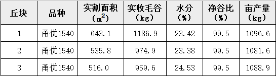 專家組現(xiàn)場隨機(jī)抽取了3丘示范田,采用聯(lián)合收割機(jī)實(shí)割,按農(nóng)業(yè)農(nóng)村部超級(jí)稻測產(chǎn)驗(yàn)收辦法測產(chǎn)。測產(chǎn)結(jié)果如下: