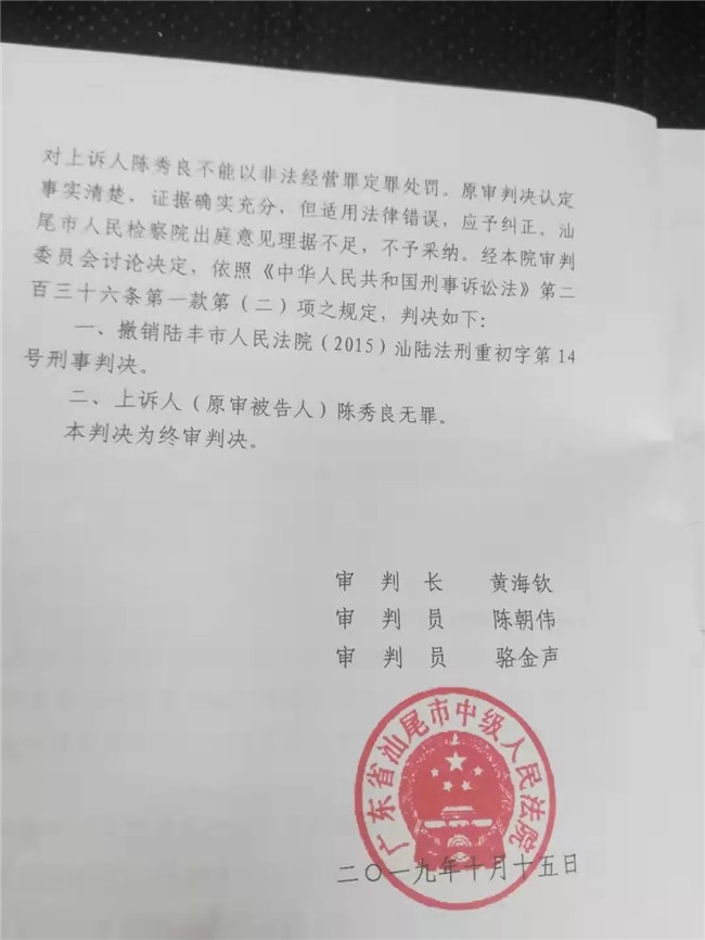 2019年10月15日,汕尾市中級(jí)人民法院作出終審判決:陳秀良無(wú)罪。