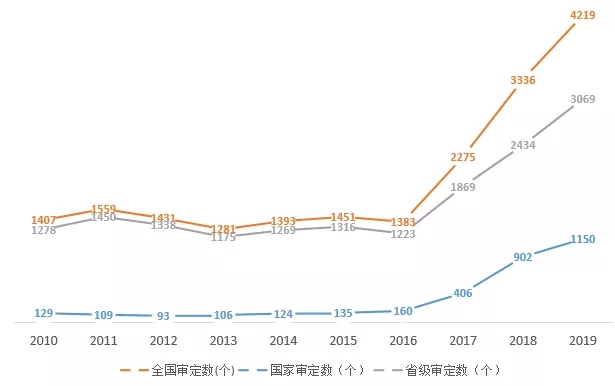 審定水稻品種,比2018年、2017年分別增加312個(gè)、532個(gè),是2010—2016年審定平均數(shù)的2.63倍。
