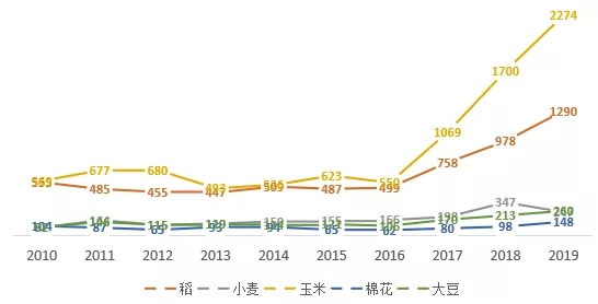 △近10年我國(guó)5種主要農(nóng)作物品種審定情況