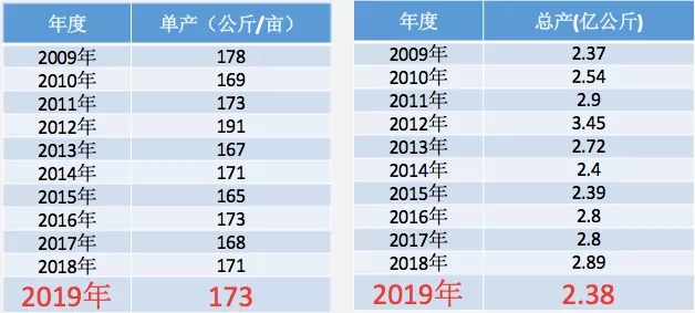 2009-2019雜交水稻制種單產(chǎn)及總產(chǎn)變化情況