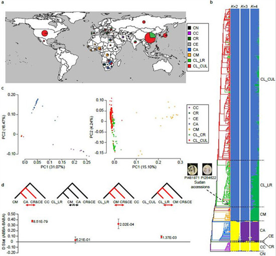 中國農(nóng)科院深圳農(nóng)業(yè)基因組研究所黃三文研究員介紹,其所在團(tuán)隊協(xié)同鄭州果樹研究所、北京市農(nóng)林科學(xué)院、美國康奈爾大學(xué)組成聯(lián)合攻關(guān)團(tuán)隊,采用單分子測序、光學(xué)圖譜與Hi-C三維基因組聯(lián)合分析,完成了高質(zhì)量的西瓜基因組序列圖譜。繼而對400多份種質(zhì)資源開展了基因組變異分析,共鑒定近2000萬個SNP。在此基礎(chǔ)上,首次明確了西瓜7個種之間的進(jìn)化關(guān)系,發(fā)現(xiàn)野生黏籽西瓜是距現(xiàn)代栽培西瓜親緣關(guān)系最近的種群,也發(fā)現(xiàn)了利用野生西瓜進(jìn)行抗性改良的基因組痕跡。