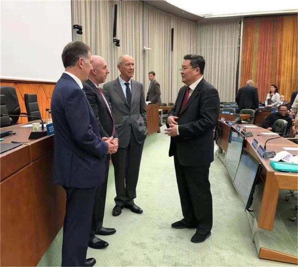 崔野韓博士(右一)與世界知識(shí)產(chǎn)權(quán)組織(WIPO)總干事、UPOV秘書長Francis Gurry先生(右二),UPOV副秘書長Peter Button先生(左一),UPOV行政管理和法律委員會(huì)主席Anthony Parker先生(左二)交談