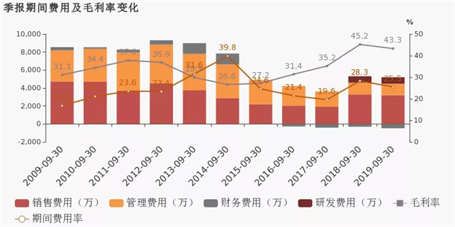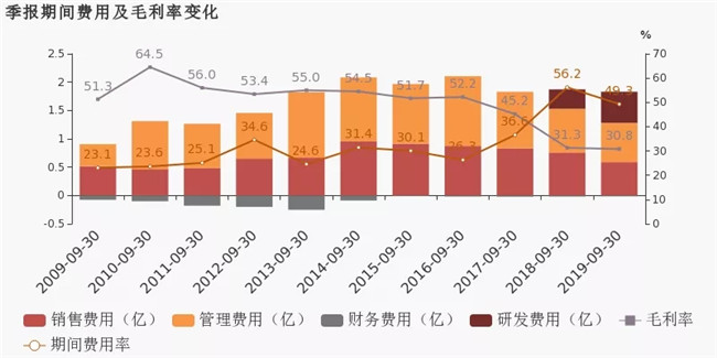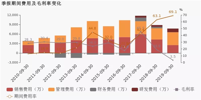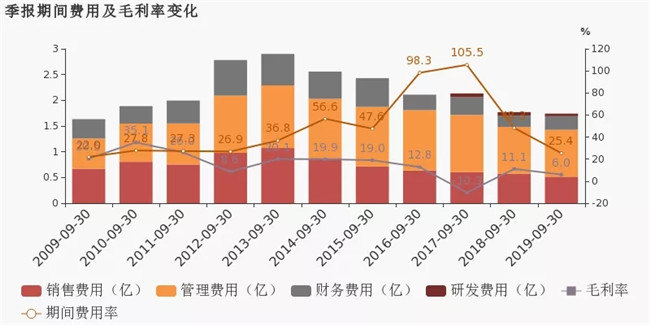 公司2019三季度營業(yè)成本1億,同比增長8.3%,高于營業(yè)收入4.8%的增速,導致毛利率下降1.9%。期間費用率為25.5%,較去年下降2.8%,費用控制合理。