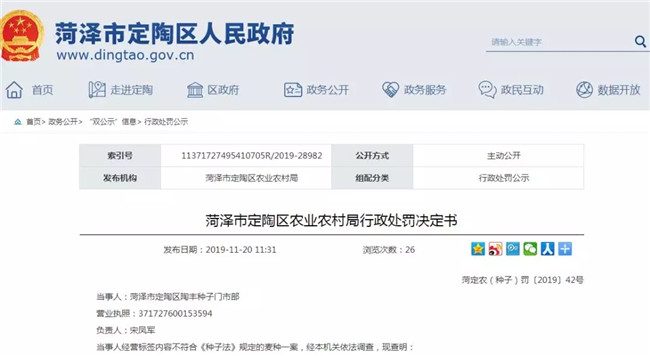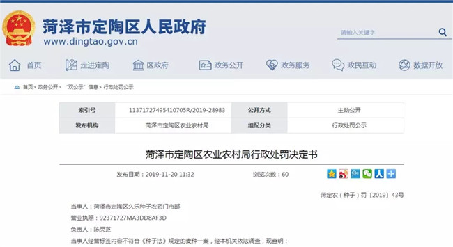 2019年9月26日,菏澤市定陶區(qū)農(nóng)業(yè)農(nóng)村局執(zhí)法人員在市場檢查時,發(fā)現(xiàn)當事人經(jīng)營的青農(nóng)2號麥種(魯農(nóng)審2010070)包裝袋標簽標識與審定公告內(nèi)容不符,執(zhí)法人員當場進行勘驗,該小麥種子共60袋(15kg/袋),對該麥種就地登記保存,并制作現(xiàn)場勘驗筆錄和證據(jù)登記保存清單。經(jīng)領(lǐng)導(dǎo)批準,對當事人的經(jīng)營行為進行立案調(diào)查。執(zhí)法人員詢問了當事人的有關(guān)情況,并制作了詢問筆錄。9月27日本機關(guān)向當事人送達了《行政處罰事先告知書》,在規(guī)定的時間內(nèi),當事人未提出陳述申辯或申請聽證。