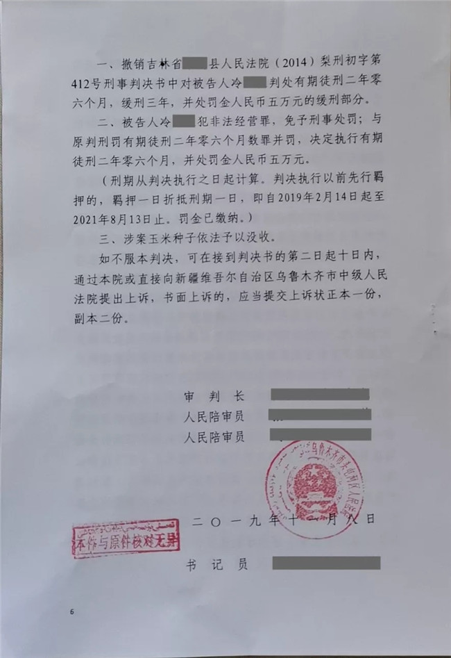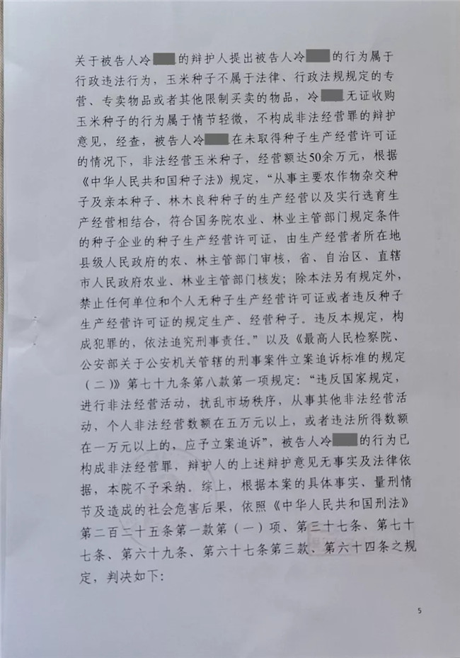 人民法院經(jīng)審理認(rèn)定,侵權(quán)人冷某的違法犯罪行為嚴(yán)重擾亂了種子生產(chǎn)經(jīng)營的市場秩序,情節(jié)嚴(yán)重,構(gòu)成非法經(jīng)營罪。依法判處冷某有期徒刑二年零六個月,并處罰金人民幣五萬元,涉案玉米種子依法予以沒收。