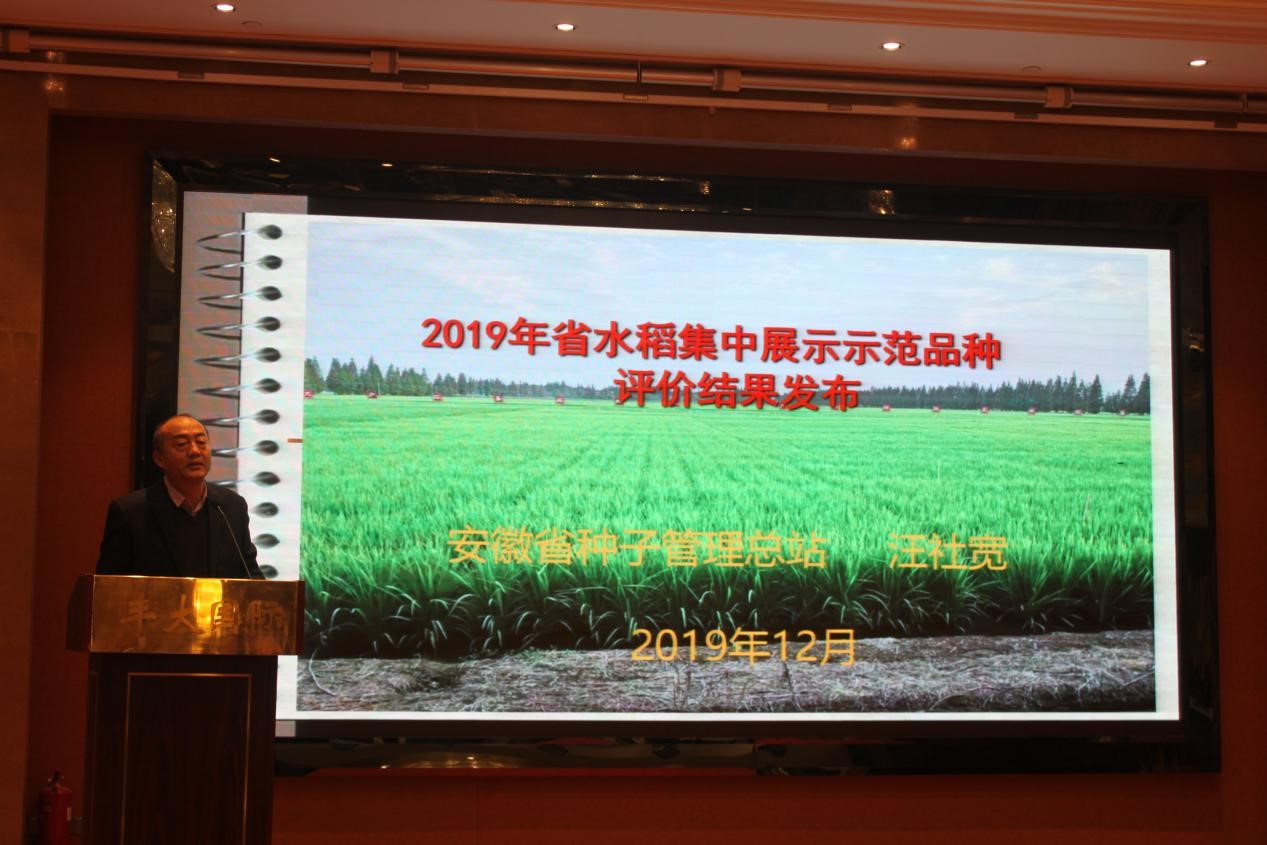 會上安徽省種子管理總站汪社寬副站長作了《2019年省水稻集中展示示范品種評價結果發(fā)布》。2019年省水稻集中展示示范品種共211個(展示品種196個、示范品種15個),其中審定品種135個,引種備案品種14個,處于試驗中的苗頭品種62個,整個展示示范面積180畝。省種子管理總站組織專家根據生育期、產量、品質、抗性、審定時間等,推選出了嘉優(yōu)中科6號、隆兩優(yōu)1212、荃9優(yōu)5號、巧兩優(yōu)絲苗、隆兩優(yōu)149、兩優(yōu)391、豐兩優(yōu)7號、兩優(yōu)1318、華浙優(yōu)1號等52個綜合性狀突出的品種。2019展示工作已經圓滿結束,在2020年農作物品種示范展示工作中,一是希望希望科研單位、種子企業(yè)高度重視省、市、縣三級品種展示示范工作;二是希望科研單位、種子企業(yè)積極參加省、市、縣三級品種展示示范,把自己的優(yōu)勢品種通過省、市、縣三級展示平臺宣傳出去,推廣出去。
