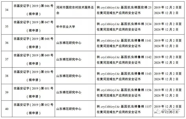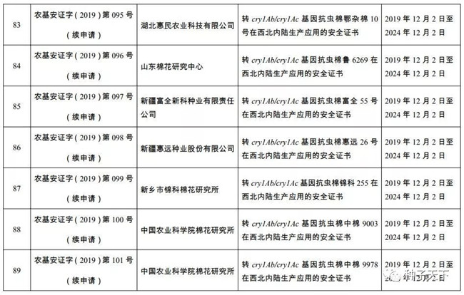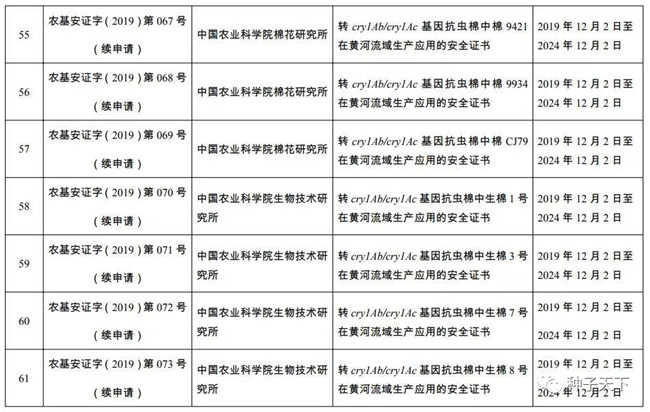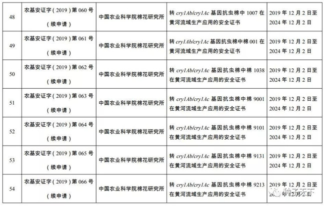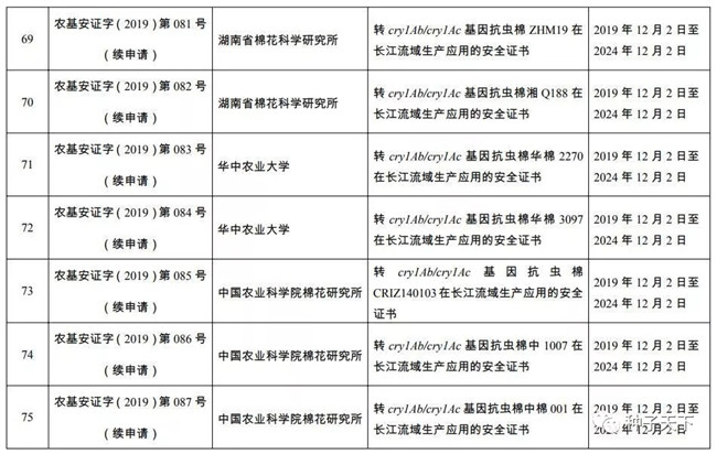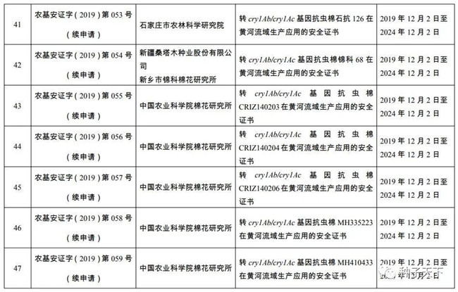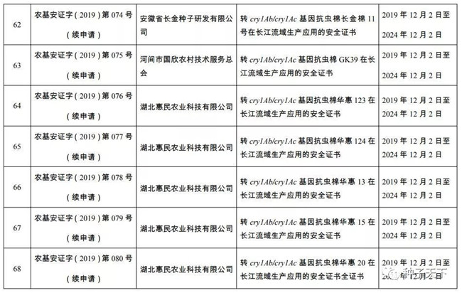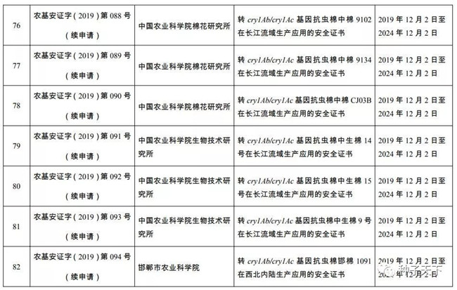 公布的281個(gè)生產(chǎn)應(yīng)用安全證書中,79個(gè)為到期續(xù)展的抗蟲棉,1個(gè)為到期續(xù)展的植物菌劑,新批準(zhǔn)9個(gè)轉(zhuǎn)基因動物疫苗及生物制劑、189個(gè)抗蟲棉、2個(gè)抗蟲耐除草劑玉米、1個(gè)耐除草劑大豆。