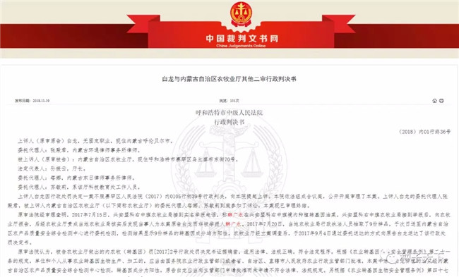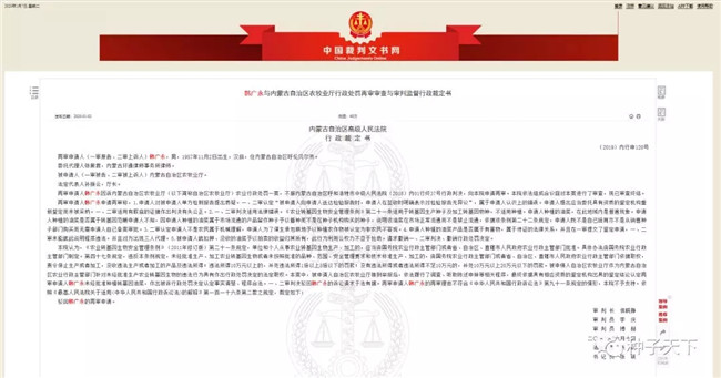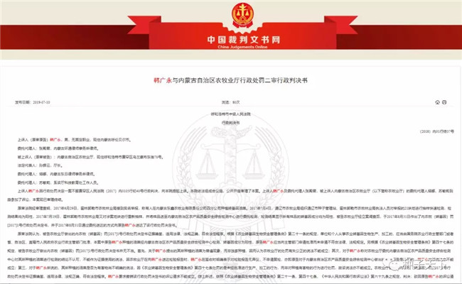 2020年1月2日,中國裁判文書網(wǎng)公開《韓廣永與內(nèi)蒙古自治區(qū)農(nóng)牧業(yè)廳行政處罰再審審查與審判監(jiān)督行政裁定書》——內(nèi)蒙古自治區(qū)高級法院于2019年6月10日駁回韓廣永的再審申請。