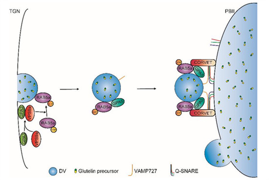 該團隊發(fā)現(xiàn)了一個新的谷蛋白后高爾基體分選缺陷突變體gpa5,通過圖位克隆的方法證實GPA5編碼一個具有磷脂結合能力的植物特有調控因子。在胚乳細胞中,GPA5特異分布在致密囊泡外圍。亞細胞定位分析證實GPA5的膜定位依賴于前期鑒定的調控因子GPA1/Rab5a和GPA2/VPS9a。生化分析進一步證實GPA5可特異與GPA1/Rab5a的激活形式互作,表明GPA5可能是GPA1/Rab5a的效應因子。后續(xù)的功能研究發(fā)現(xiàn),GPA5可與栓系復合體CORVET和含有VAMP727的膜融合復合體SNARE互作來最終介導致密囊泡與蛋白貯藏液泡的融合,以完成谷蛋白的轉運。