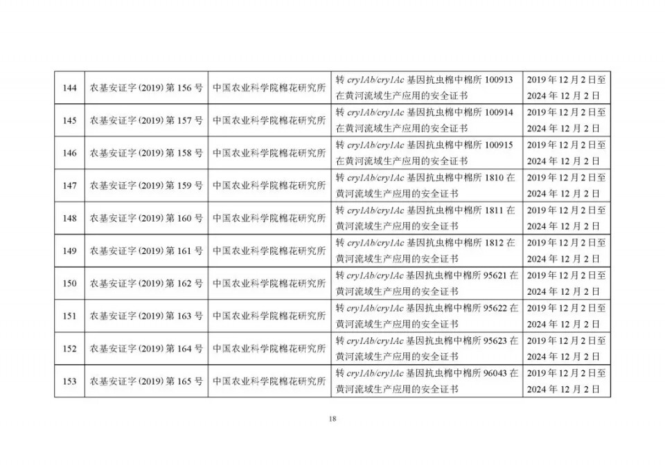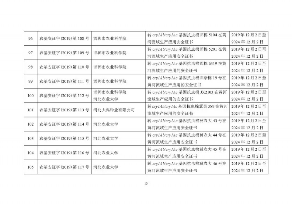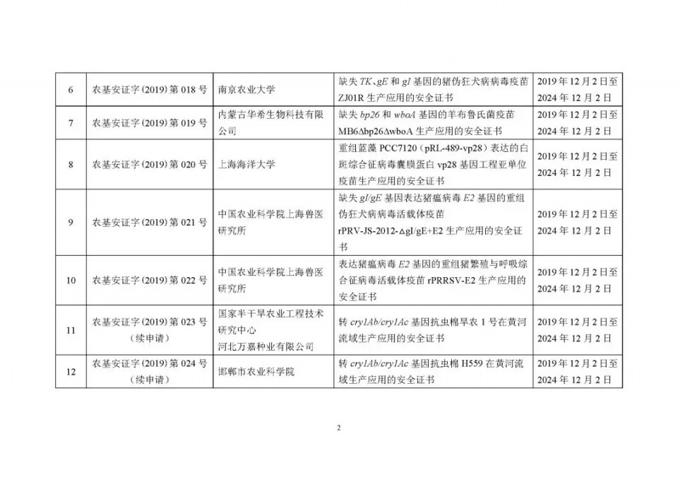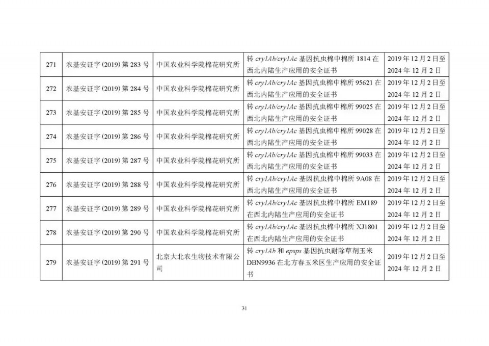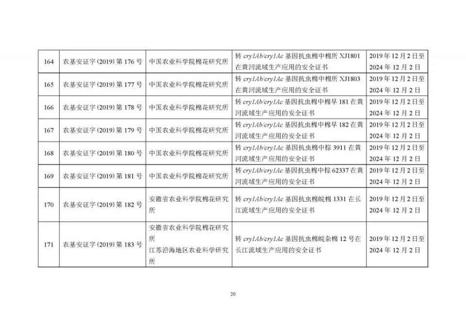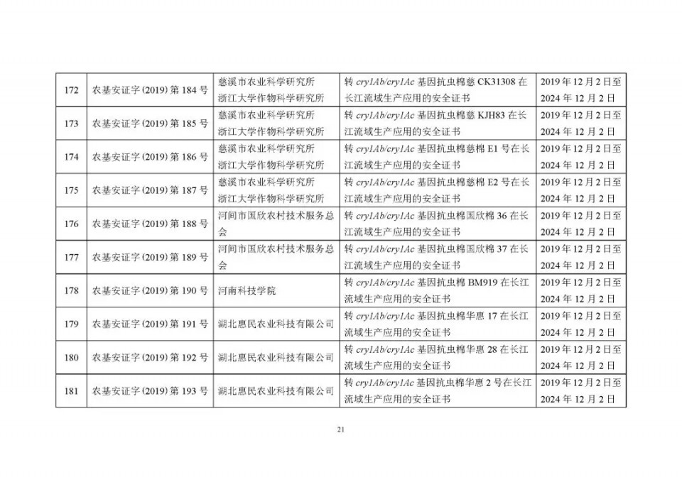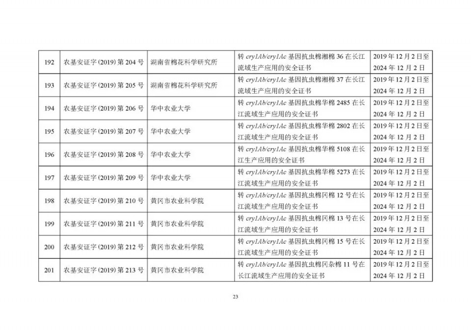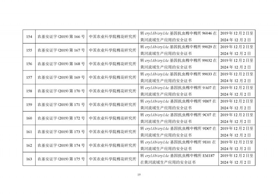 2020年1月21日15:00農(nóng)業(yè)農(nóng)村部網(wǎng)站公布了 2019 年農(nóng)業(yè)轉(zhuǎn)基因生物安全證書(shū)(生產(chǎn)應(yīng)用)批準(zhǔn)清單 ,詳見(jiàn)如下: