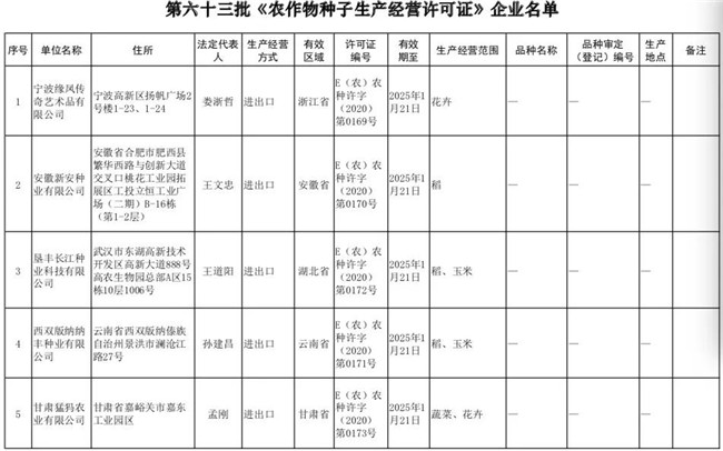 第六十三批《農(nóng)作物種子生產(chǎn)經(jīng)營(yíng)許可證》企業(yè)名單