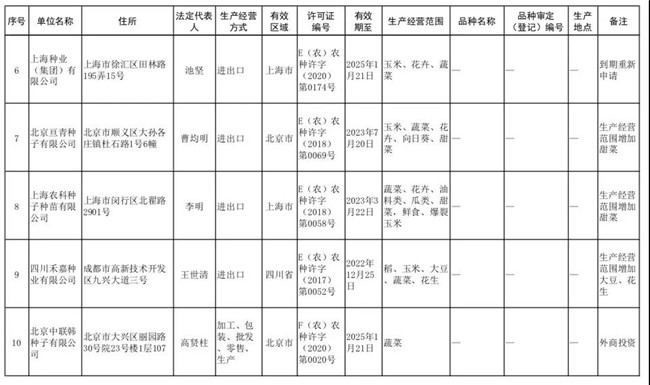 等10家企業(yè)《農(nóng)作物種子生產(chǎn)經(jīng)營(yíng)許可證》(詳見附件)。