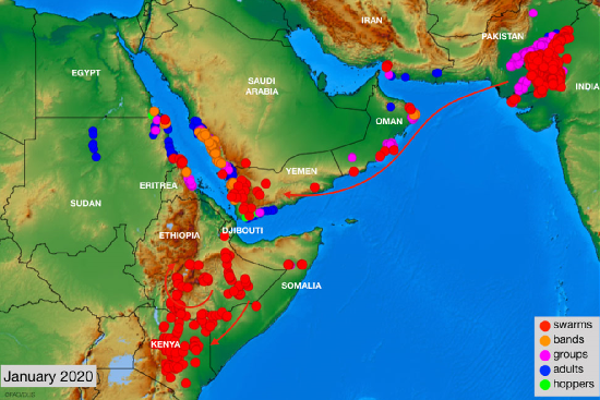 2月10日,聯(lián)合國(guó)糧食及農(nóng)業(yè)組織(FAO)向全球發(fā)布了沙漠蝗災(zāi)害最近一期預(yù)警,災(zāi)害涉及非洲之角、紅海沿岸國(guó)家埃塞俄比亞、索馬里,有報(bào)道烏干達(dá)、坦桑尼亞也有沙漠蝗發(fā)生,不久將擴(kuò)散進(jìn)入周邊國(guó)家更廣泛的區(qū)域。紅海西岸蘇丹、厄立特里亞,阿拉伯半島沙特阿拉伯、也門已經(jīng)開始防治工作。聯(lián)合國(guó)糧食及農(nóng)業(yè)組織希望全球高度戒備正在肆虐的蝗災(zāi),防止被入侵國(guó)家出現(xiàn)糧食危機(jī)。