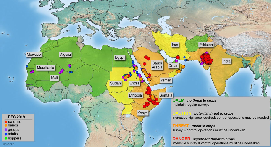 聯(lián)合國(guó)糧食及農(nóng)業(yè)組織近日警告稱,埃塞俄比亞、肯尼亞和索馬里境內(nèi)沙漠蝗蟲數(shù)量已達(dá)到約3600億只,其規(guī)模和破壞力使非洲之角的糧食安全面臨前所未有的威脅。若該區(qū)域不擴(kuò)大應(yīng)對(duì)行動(dòng)的規(guī)模,蝗災(zāi)將擴(kuò)散到東非更多國(guó)家。