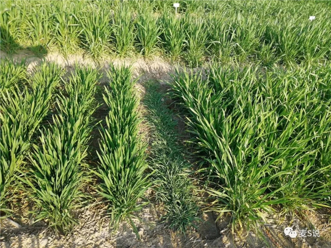 有時(shí)我們可以看到或聽(tīng)到有人將小麥凍害發(fā)生的原因羅列成多種,譬如不恰當(dāng)?shù)牟テ?、播量,整地質(zhì)量低下、墑情表現(xiàn)不足等等,看似都有道理,但我要說(shuō)的是,在同等條件下,小麥凍害的發(fā)生主要就一個(gè)因素——品種抗寒性不行!在沒(méi)有凍害發(fā)生的年份,小麥不同品種間的越冬表現(xiàn)沒(méi)有什么差異,表現(xiàn)都一樣;但當(dāng)有凍害發(fā)生的年份,我們就會(huì)發(fā)現(xiàn),不是所有的品種都有凍害發(fā)生,同樣的地塊和栽培管理模式下,不同品種間凍害的表現(xiàn)和最終產(chǎn)量都有明顯差。這說(shuō)明,品種抗寒性不行是發(fā)生凍害的主要因素。如下圖1所示,春性強(qiáng),顏色淡,幼習(xí)直立……