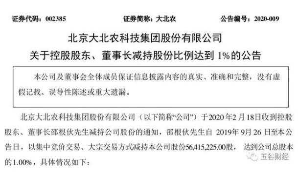 近日,大北農(nóng)(002385.SZ)發(fā)布關(guān)于控股股東、董事長減持股份的公告,表示于2月18日收到控股股東、董事長邵根伙減持公司股份的通知,邵根伙自2019年9月26日至今,已通過大宗交易減持26400970股,占總股本的0.63%,通過集中競價交易減持30014255股,占總股本的0.72%,合計減持 56415225股,占總股本的1.34%。