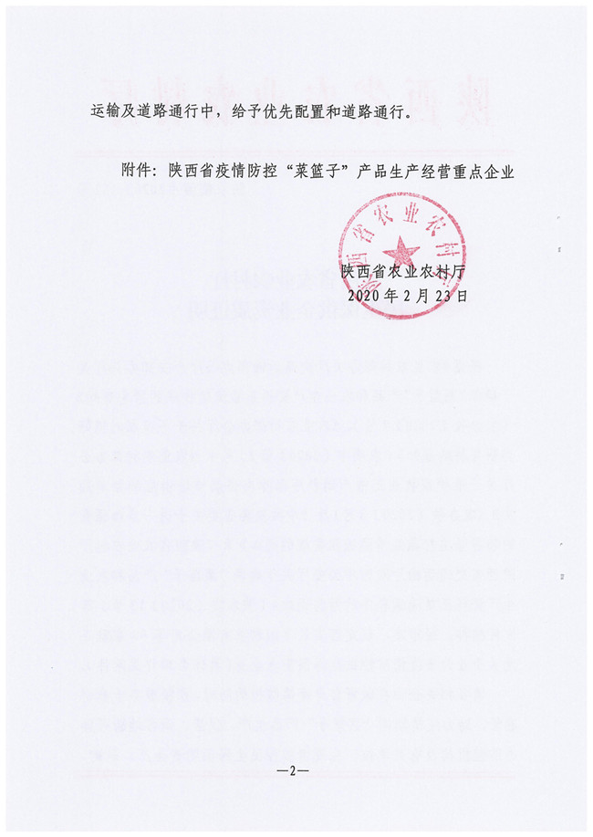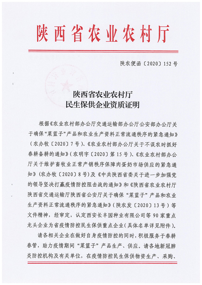 陜西省農(nóng)業(yè)農(nóng)村廳關(guān)于民生保供企業(yè)資質(zhì)的證明
