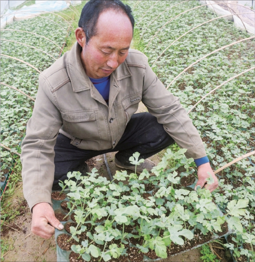 育苗基地里察看苗情。該合作社以“基地+合作社+貧困戶”的種植模式,立春后育出6萬余棵優(yōu)良品種西瓜苗,可滿足周邊貧困戶和合作基地移栽,并吸納周圍30余名貧困群眾在家門口就業(yè)增收致富。